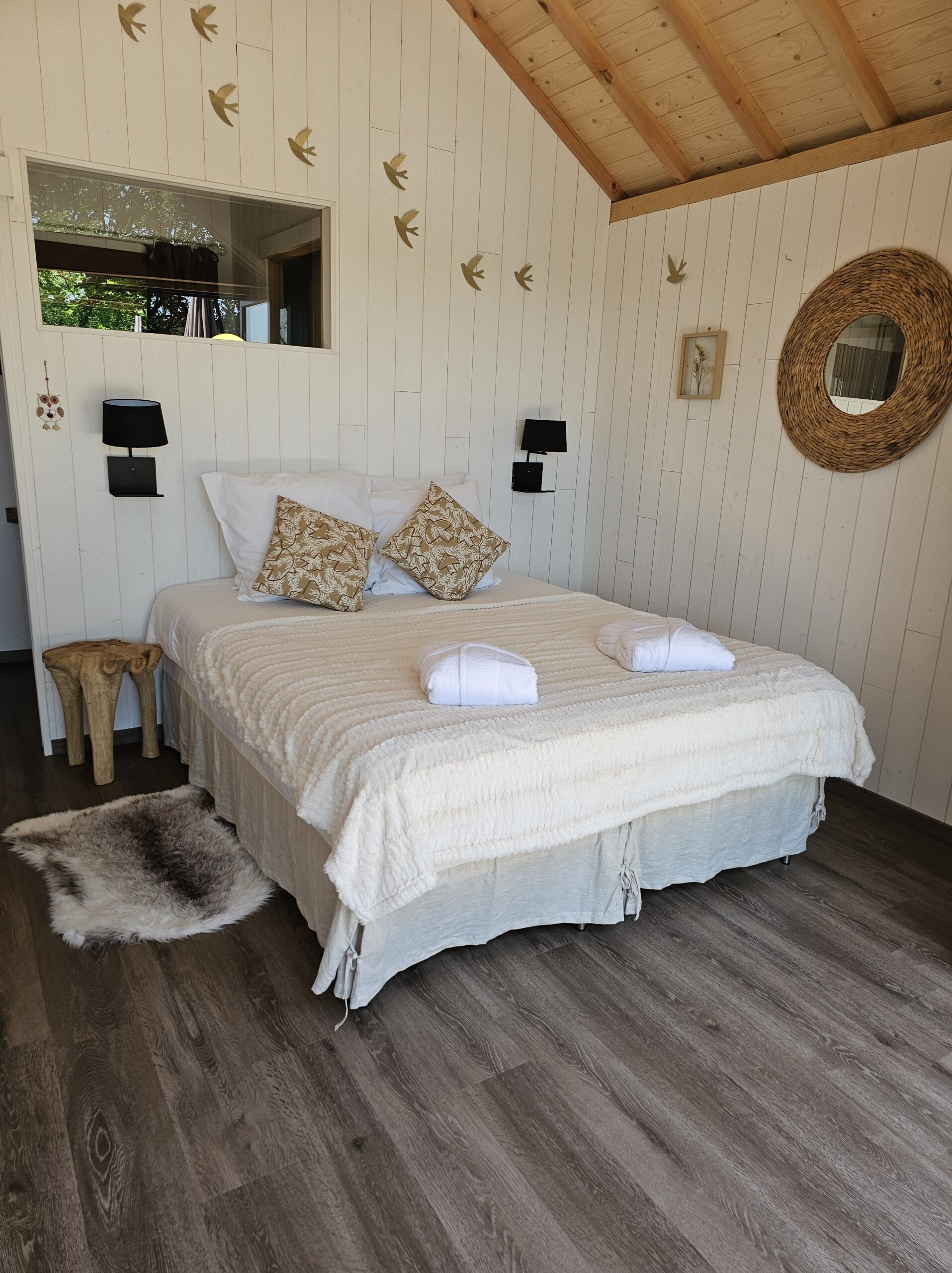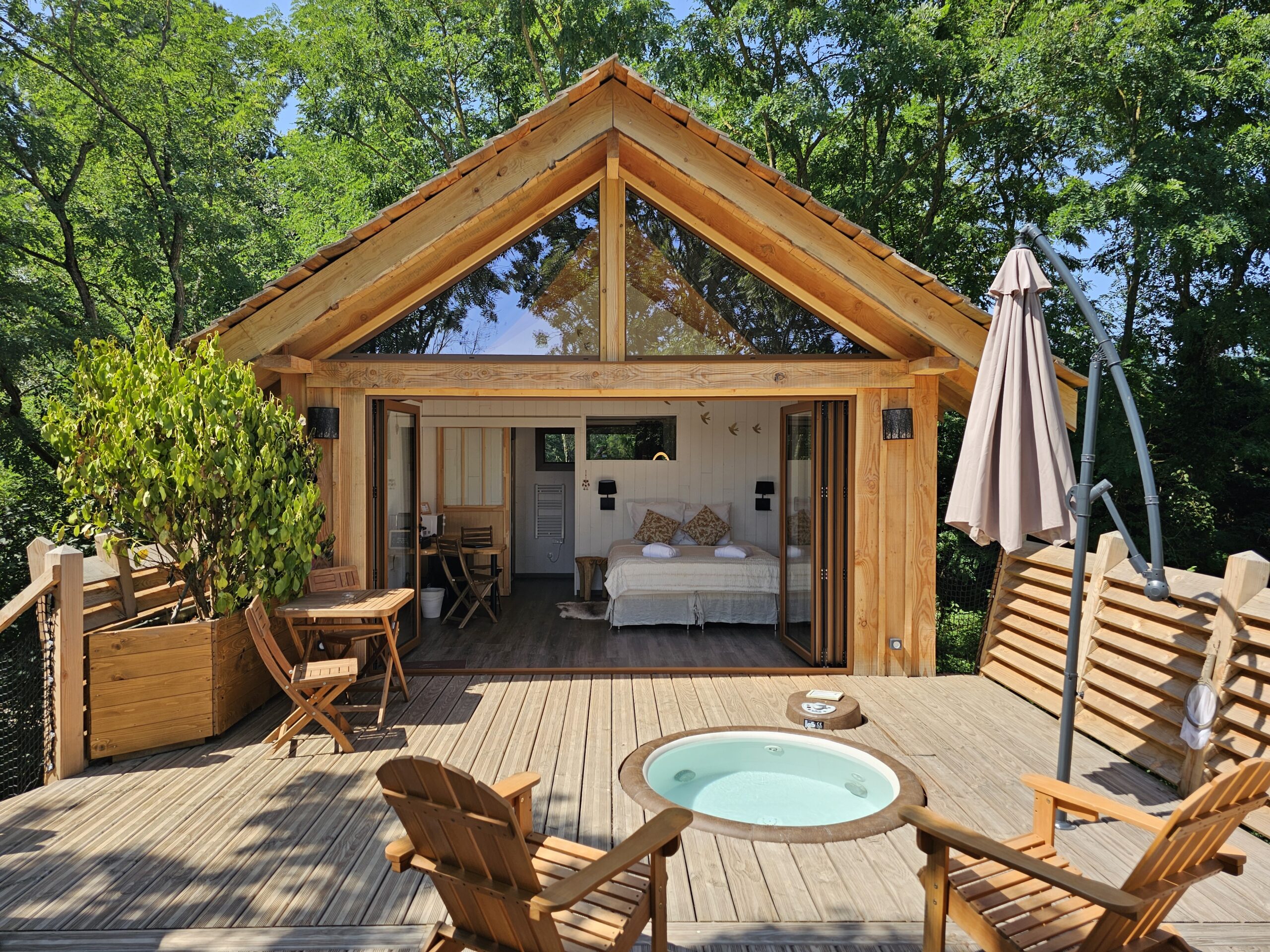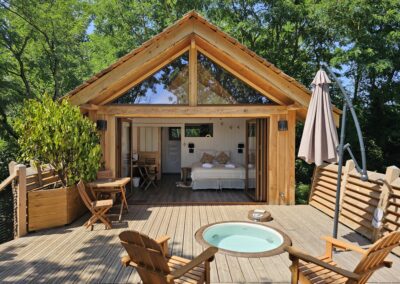 C’est la cabane rêvée pour une nuit insolite en amoureux. D’ailleurs, c’est la jumelle de la cabane des Rêves ! Avec sa décoration inspirée de la nature et du voyage, sa douce atmosphère est une invitation au bien-être. Linge de lit, serviettes, peignoirs pour la sortie du jacuzzi, thés bio…Tout est à votre disposition !